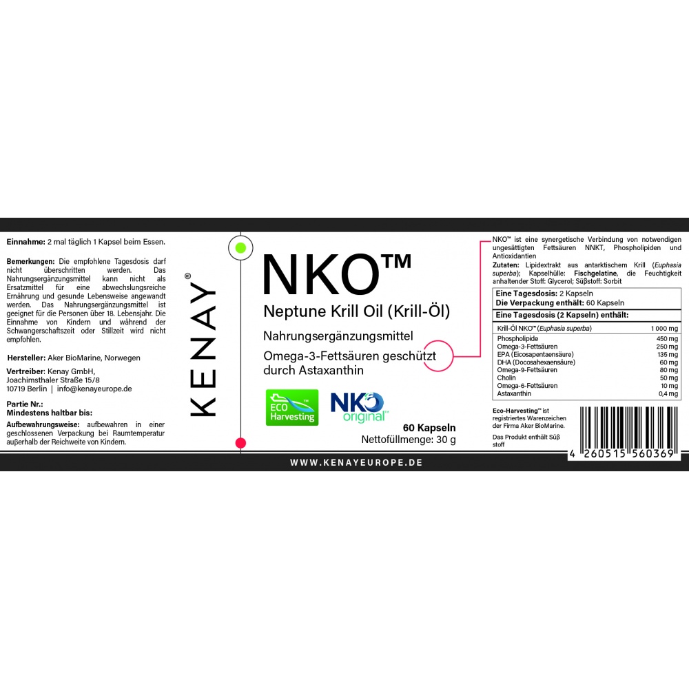 Ingredienti: estratto lipidico del crostaceo krill antartico (Euphasia superba), capsula: gelatina di pesce, sostanza igroscopica: glicerolo, dolcificante: sorbitolo.