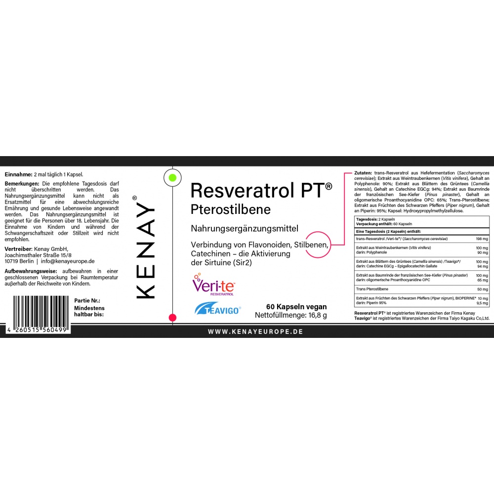 Ingredienti: estratto di radice di poligono del Giappone (Polygonum cuspidatum); contenuto di trans-resveratrolo - composto puro micronizzato: 95%, estratto di vinacciolo (Vitis vinifera), contenuto di proantocianidine: 90%, estratto di foglie di tè verde (Camellia sinensis), contenuto di catechine EGCg: 94%, estratto di corteccia di pino marittimo francese (Pinus pinaster) contenuto di proantocianidine oligomeriche OPC: 65%, estratto di frutti di mirtillo (Vaccinium L.), contenuto di pterostilbeni: 90%, estratto di frutti di pepe nero (Piper nigrum), contenuto di piperina: 95%, involucro della capsula: idrossipropilmetilcellulosa.