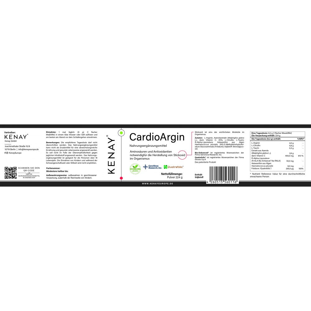 Ingredienti: L-arginina, acerola, L-citrullina, L-taurina, acido alfa-lipoico, astaxantina, acido folico, dolcificante: stevia.