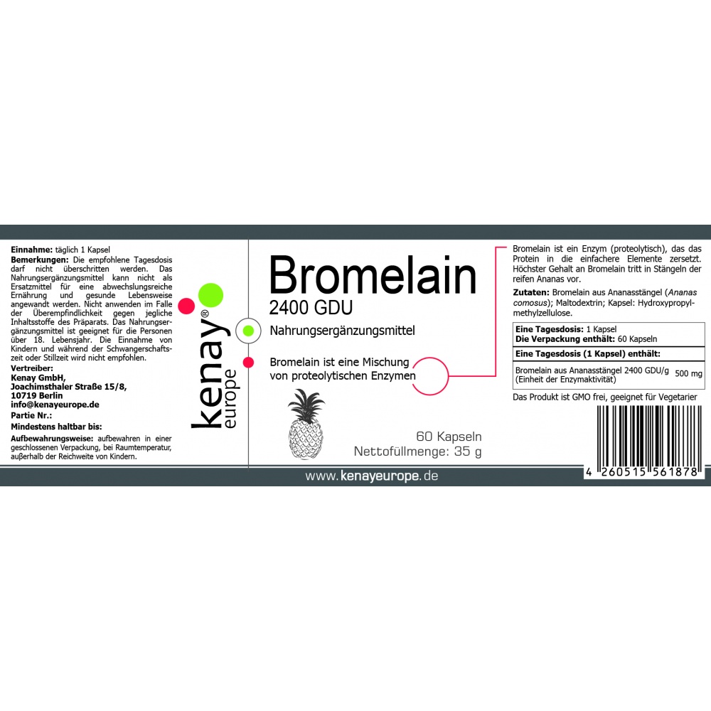 Bromelain aus Ananasstängel 2400 GDU/g (Enheit der Enzymaktivität) | 500 mg |